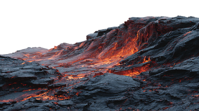 Sloping volcanic mountainside with glowing orange lava cascading down isolated on transparent background