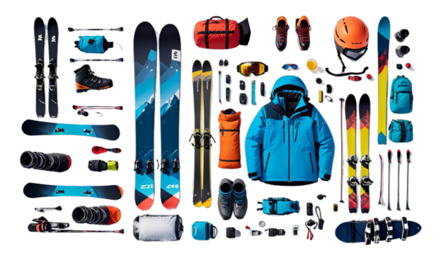 A skier on a mountainside in motion with splashes of snow containing small particles on an isolated transparent background. Back view.. PNG.