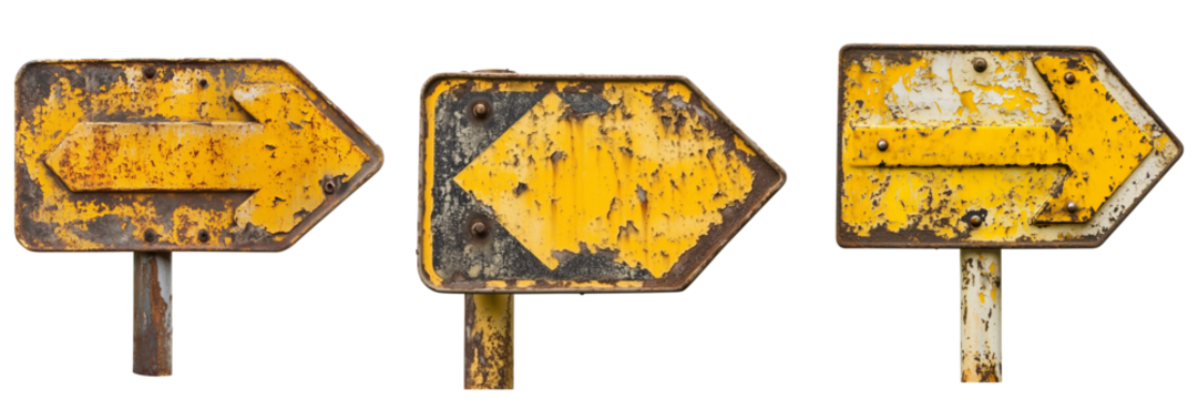 Set of A simple street sign with bold yellow and black text mounted on a metal pole on transparent png background
