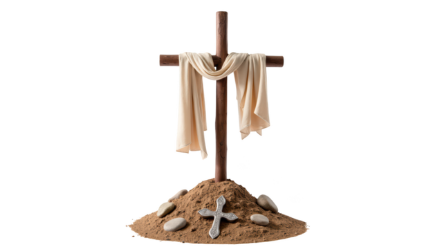 Wooden cross draped with fabric stands on mound of sand, surrounded by smooth stones, symbolizing faith and remembrance