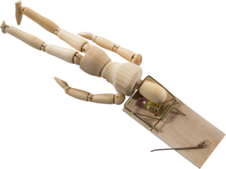 3d image of wooden figurine caught in mouse trap