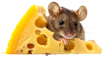 A cute mouse peeking out from behind a large wedge of Swiss cheese.