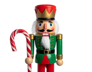 A wooden toy soldier, a nutcracker, stands holding a candy cane, isolated on black