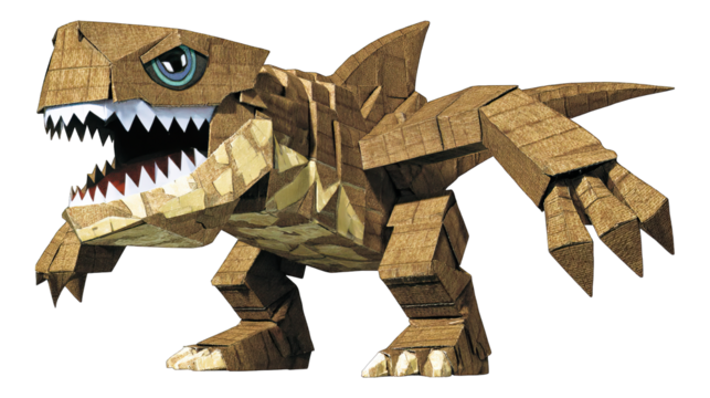 Cartoonish creature made of textured brown material, baring its teeth