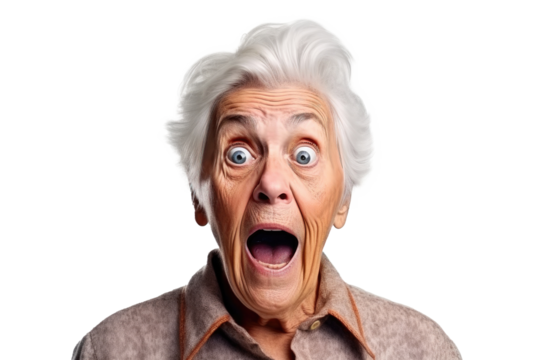 Portrait of amazed old woman with an open mouth and round big eyes on a transparent background