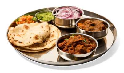 A traditional and authentic Maharashtrian mutton thali served in a round stainless steel plate with multiple bowls on a transparent background