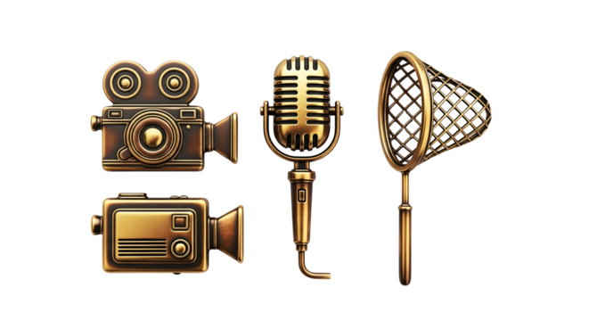 A curated set of antique golden objects including two retro movie cameras, a classic microphone, and a delicate butterfly net, all presented distinctly on a transparent backdrop.