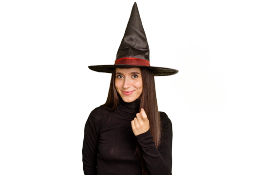 Young caucasian woman dressed as a witch for halloween day isolated pointing with finger at you as if inviting come closer.