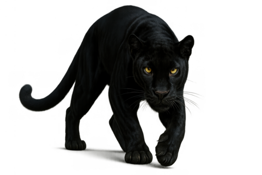 Black panther stalking forward with intense yellow eyes, wild feline predator ready to pounce on transparent background