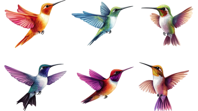 six vibrant hummingbirds in flight. showcasing a variety of colorful plumage each bird is depicted with intricate detail. highlighting their delicate features