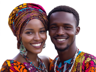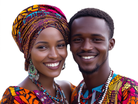 Front view mid-body shot of an extremely beautiful Mozambican couple in traditional clothing smiling isolated on a white transparent background
