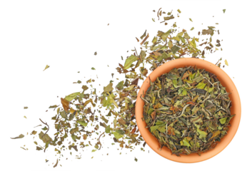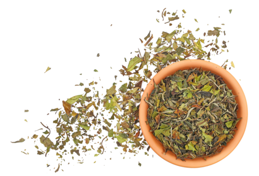 White Pai Mu Tan dried tea leaves in clay pot isolated on white, top view