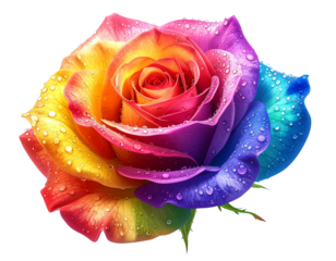 Rainbow rose flower with dew drops isolated 3d icon on white background. Beautiful mu