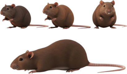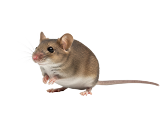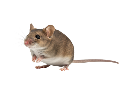 A common house mouse, Mus musculus, with soft brown-grey fur and twitching whiskers, stands alert on a transparent seamless isolated background, concept of scientific study