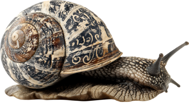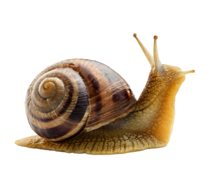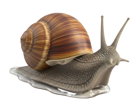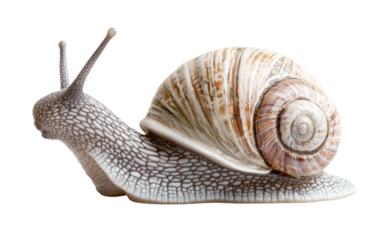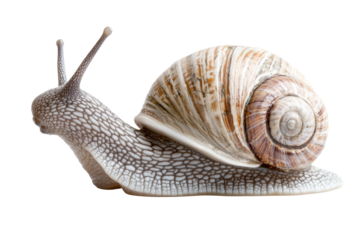 Detailed close-up of a garden snail with textured shell and mucus on isolated white background, cut out transparent