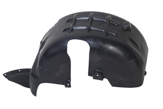 Black plastic fender liner on a white isolated background for sale or replacement in a car service. Mudguard on auto-parsing for repair or a device to protect the body from dirt.