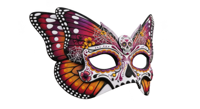 Colorful Día de Muertos sugar skull on a transparent or white background.