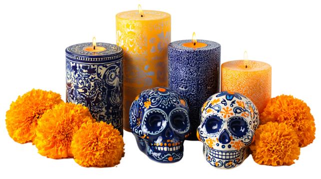 Day of the Dead (Día de Muertos) traditional items: sugar skulls, candles, and marigolds, isolated on white background