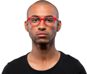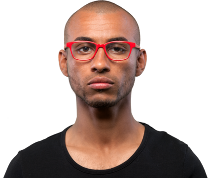 A dark young man in red glasses
