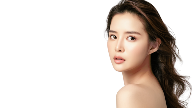 A beautiful young woman with long brown hair looks at the camera with a soft expression.  Her skin is smooth and flawless.