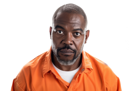mid-aged man in orange prison jumpsuit
