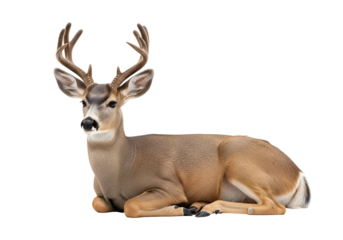 A well-lit, full shot of a mule deer lying down against a pure black background.