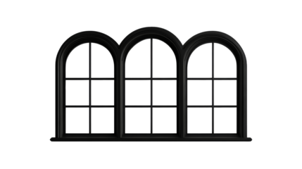 Antique wooden window frame with arched design and intricate mullions on transparent background