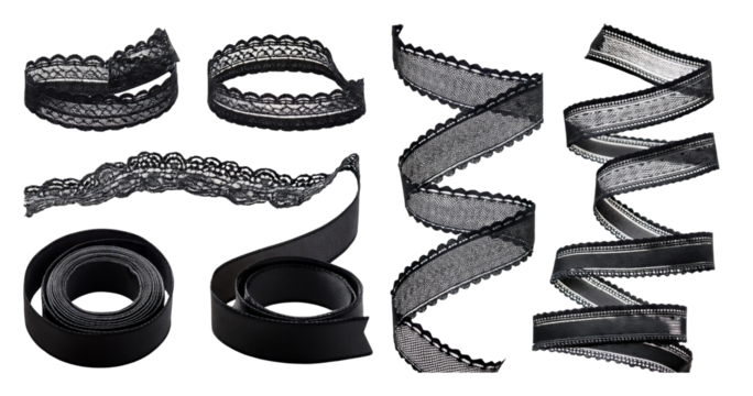 Various Types of Black Ribbons and Lace for Crafting and Decoration, isolated on transparent background