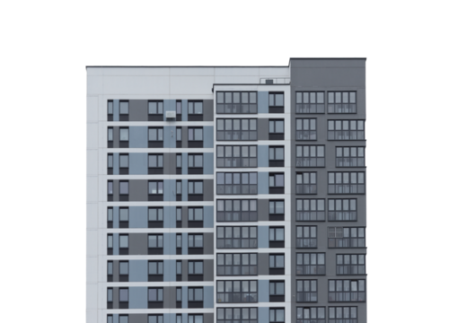 Building with modern apartment facade and geometric windows. Tall modular block representing urban
