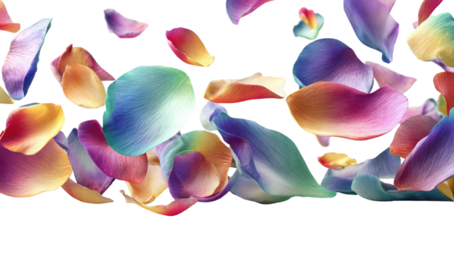 Vibrant multicolor flower petals gracefully falling in mid air on transparent background