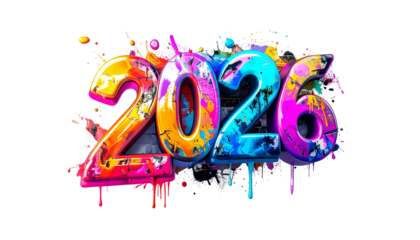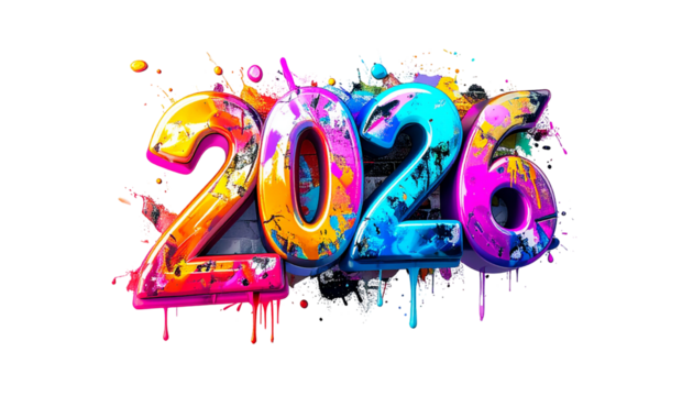 Vivid, graffiti-style "2026" with colorful splatters and textures