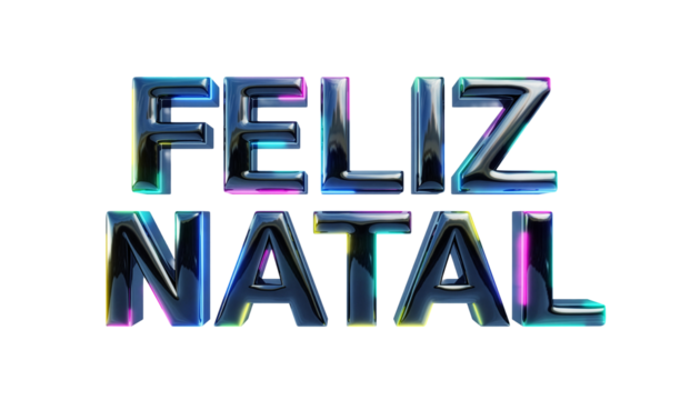 Merry Christmas greeting in Portuguese, Feliz Natal, with 3D letters. Modern typography with chrome, metallic, and iridescent effects. Isolated design element on a transparent background.