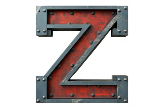 Industrial metal letter z illuminated with red aged paint isolated on transparent background