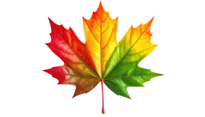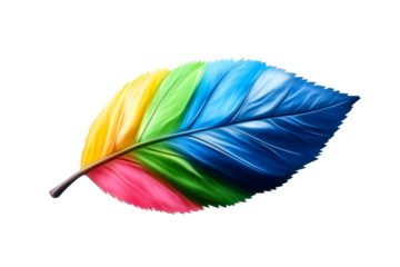 Vibrant multicolored leaf with textured segments against a stark white background, cut out transparent