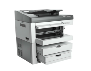 Professional office multifunction printer with scanner, copier, and fax capabilities, isolated on transparent background