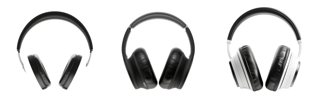 set of different views of headphones integrated with language learning technology, each designed for multilingual education, isolated on transpartent background