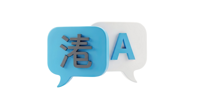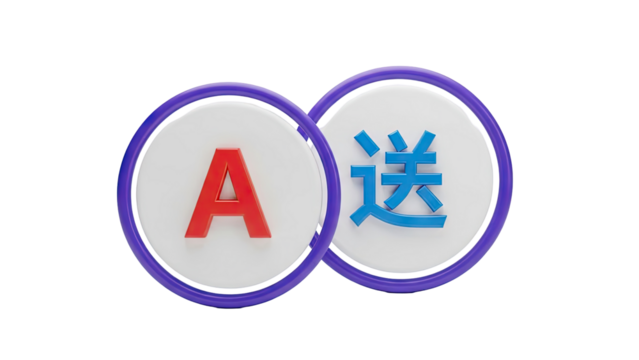 3D icons of 'A' letter and Chinese character for 'send' on transparent background