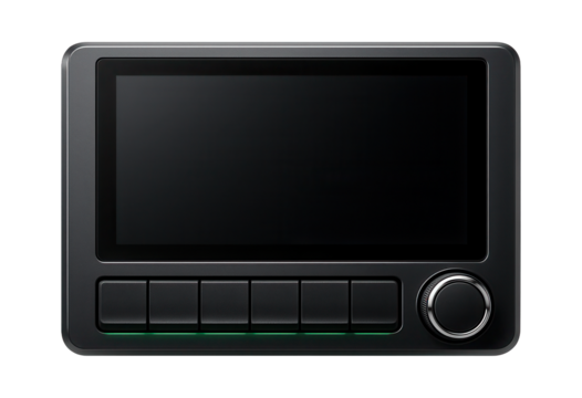 Compact car stereo with a 5-inch touchscreen and physical shortcut buttons below the screen