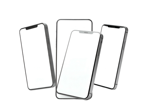 Four modern smartphones with blank white screens, arranged on a solid black background