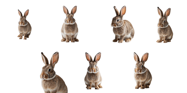 multiple rabbits of different poses and angles isolated on a transparent background showcasing detailed fur texture and color variations