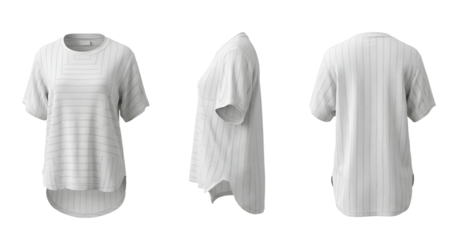 A minimalist white striped t-shirt displayed from multiple angles on a neutral background, ideal for fashion catalogues