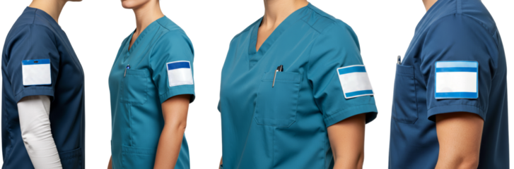 Medical scrubs displayed from multiple angles on transparent background