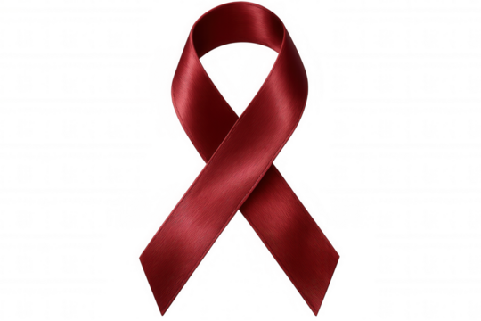 Red awareness ribbon representing solidarity for drug addiction, hiv, multiple myeloma health campaigns, displayed on transparent surface