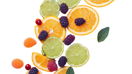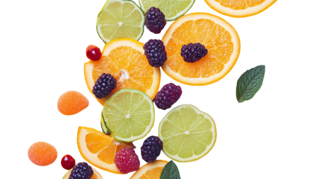 Multivitamin capsule with fruits and pills PNG isolated on transparent background, healthy diet supplement for wellness and nutrition