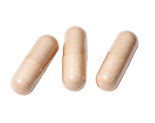 3 small beige multivitamin capsules closed on a Transparent background PNG