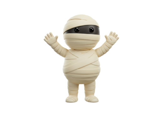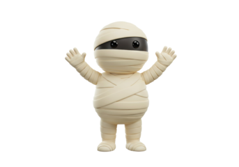 Playful cartoon mummy wrapped in bandages on transparent background