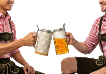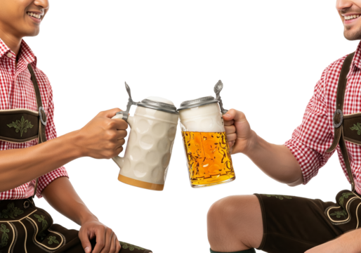PNG cut out isolated background. Two happy and diverse friends, one Asian and one Caucasian, wearing traditional Bavarian lederhosen and toasting with large glass mugs of beer to celebrate Oktoberfest