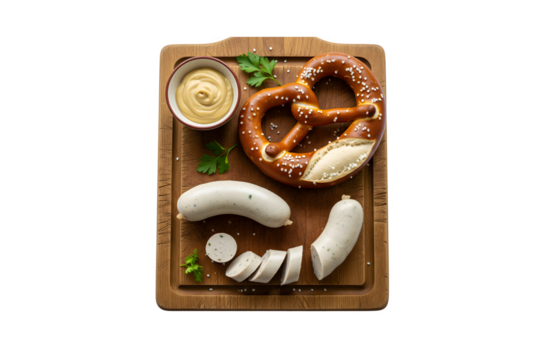 Bavarian veal sausage breakfast featuring sausages, a soft pretzel, and mild mustard served on a wooden board from Germany