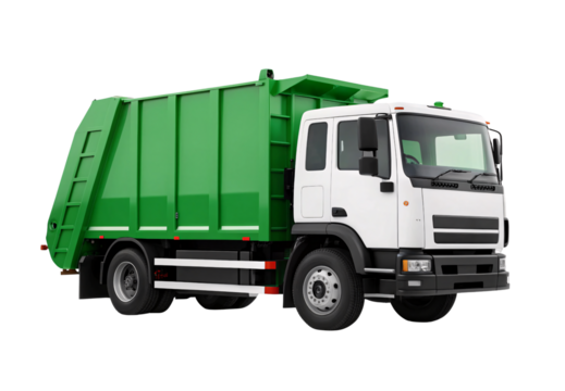 Isolated rendering presents a white and green garbage truck conveying strength, waste management