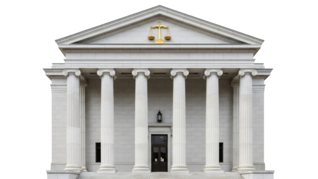 Classical courthouse building isolated PNG, government architecture with columns and scales of justice on transparent background